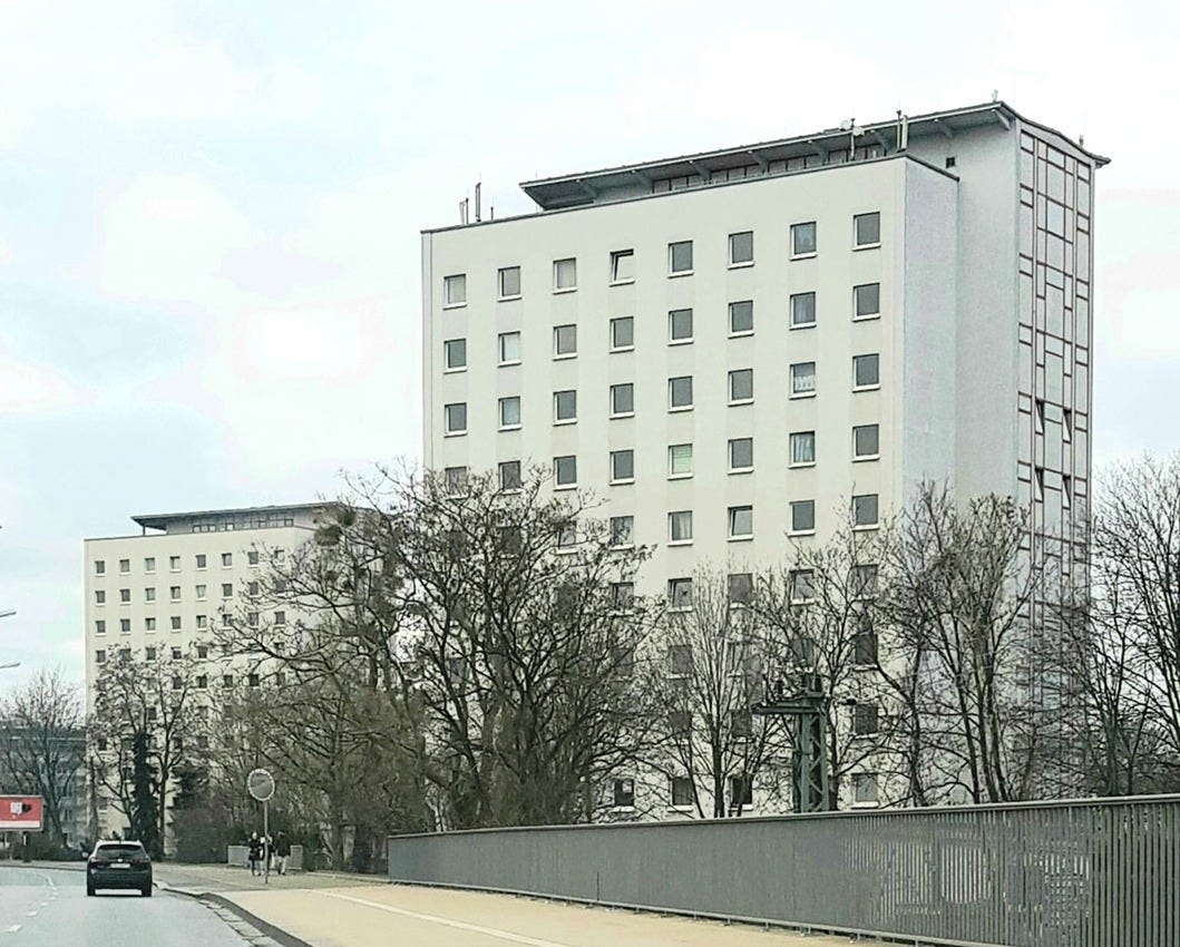 The rail yard and a shopping mall separate these nondescript, utilitarian dorms from the picturesque city center’s churches and squares. Much of Dresden’s Altstadt was rebuilt only after German reunification, which officially happened 34 years ago today.